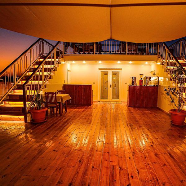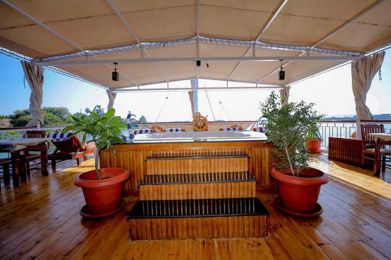 Le pont supérieur, où l'on retrouve, les deux autres suites également situées à l'arrière, un restaurant où sont servies en formule buffet, des spécialités égyptiennes préparées à bord par le chef, et un salon bar pour plus de moments de partage.