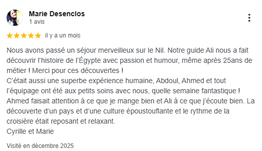 Combiné 1 nuit au Caire à l'hôtel Sonesta Cairo Hotel 5* (ou similaire) + 7 nuits de croisière sur le Nil à bord du M/S Nabilatan 5* (ou similaire) + 1 nuit au Caire à l'hôtel Hilton Cairo Grand Nile Tower 5* (ou similaire) en pension complète, avec 16 visites guidées, tous les transferts et les vols A/R inclus.