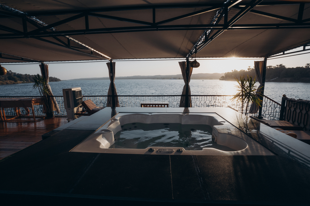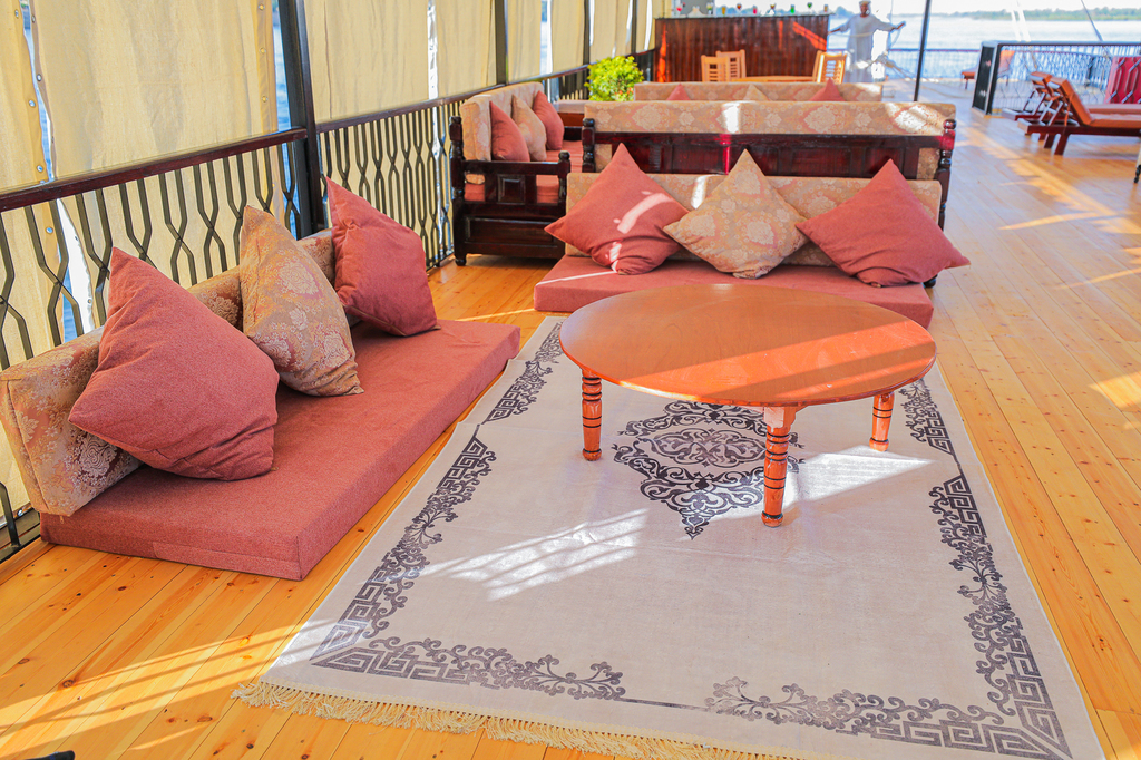 Elle dispose, d’un Jacuzzi sur le pont supérieur pour vous relaxer, ainsi que de salons et transats vous offrants des moments de détente tout en admirant les merveilleux paysages du Nil.