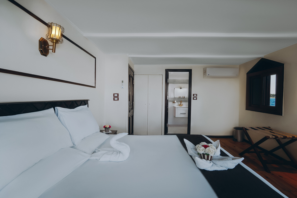 Les suites Junior sont dotées chacune d’un balcon et fenêtre offrant une vue imprenable sur le Nil, quant aux Suites Royales, elles se situent à l’arrière du bateau et disposent chacune d’une terrasse privée pour une expérience encore plus intimiste, tout en profitant des différents paysages qu’offre le Nil et ses rives tout au long de la croisière.